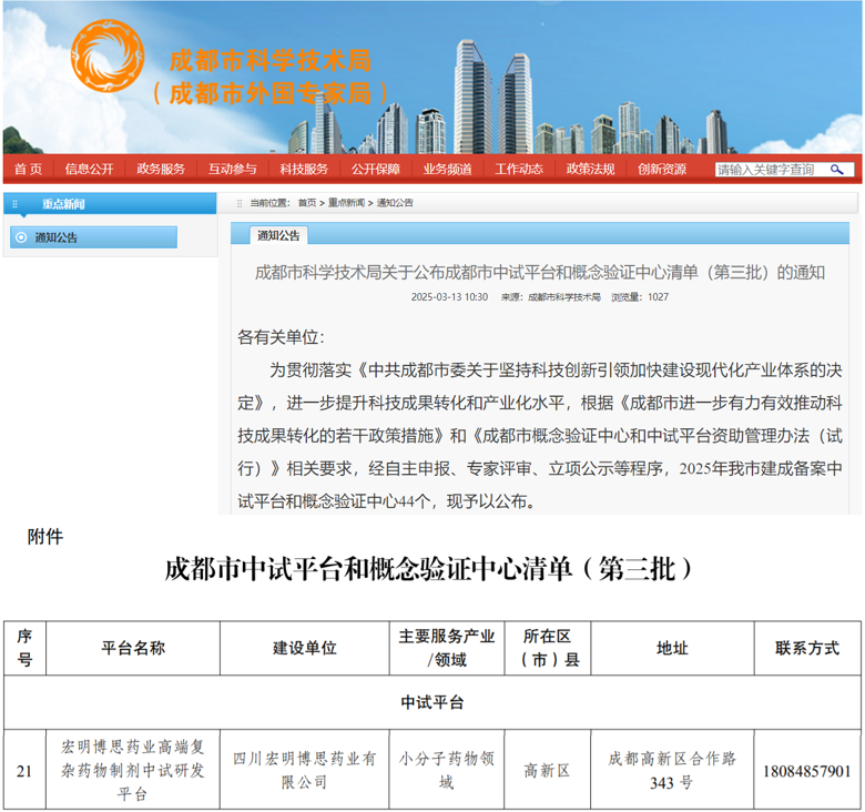 近日,成都市科学技术局正式公布《成都市中试平台和概念验证中心清单(第三批)》,赏金船长官网医药集团旗下宏明博思药业建设的“高端复杂药物制剂中试研发平台”成功入选。