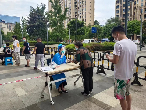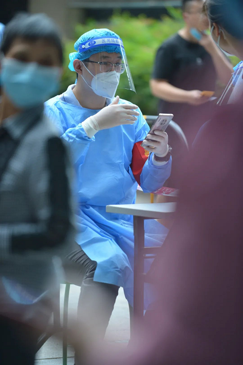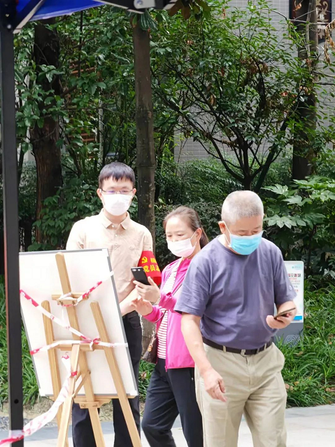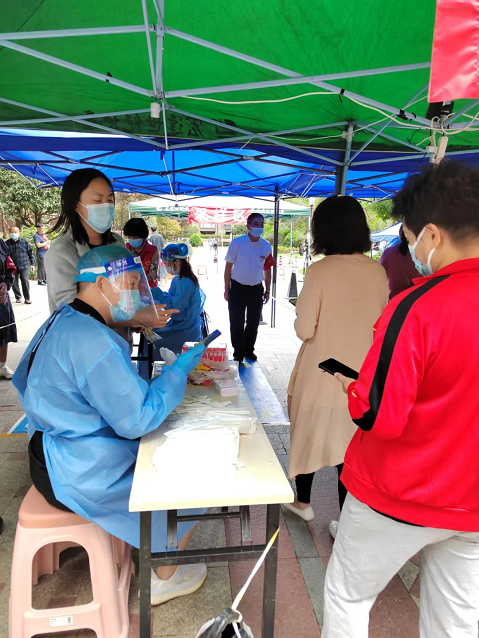 医产集团党总支委员、副总经理石冉同志在华阳街道祥龙社区参与采样点核酸检测扫码工作