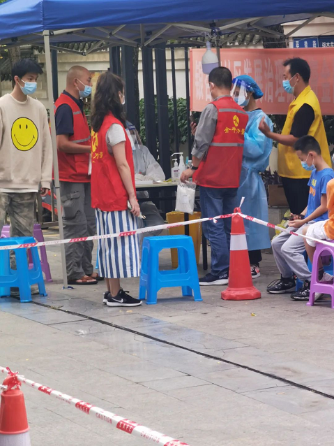 医产集团郭晓竹同志在石羊街道盛华社区参与辅助搭建核酸点位、召集住户进行核酸检测并维持现场秩序等工作